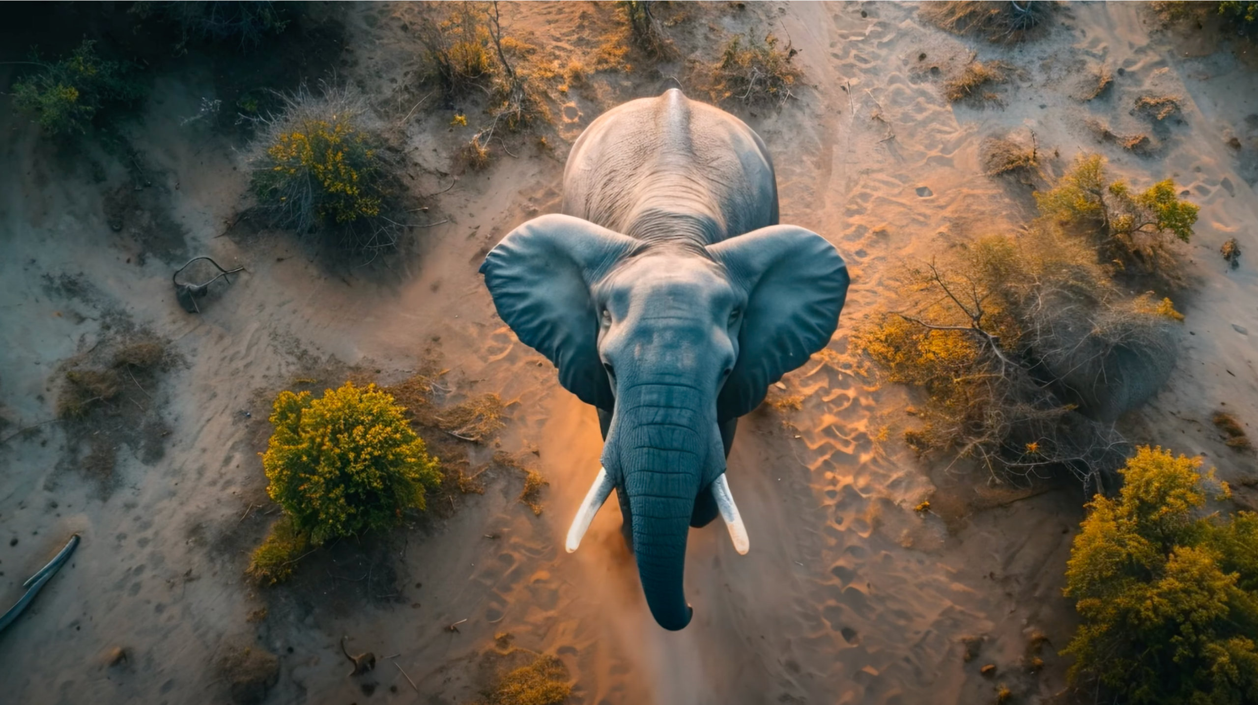 Honnêtement, je le décris comme si je l’expliquais à quelqu’un, je n’ai pas de technique, j’utilise des termes de cinéma comme « angle », je ne me souviens pas de ce que j’ai utilisé pour la première scène, mais je suppose que j’ai dû utiliser ensemble des termes comme « angle de caméra large », « plan de drone », « vue à vol d’oiseau », quand j’ai obtenu l’image que je voulais, je me souviens avoir réutilisé le numéro de la graine et avoir obtenu différentes variations de la même image avec des termes comme « éléphant dans la forêt », « désert », « rivière ».